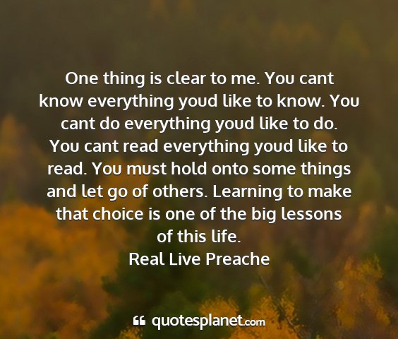 One thing is clear to me. You cant know everything youd like to know. You cant do everything youd like to do. You cant read everything youd like to read. You must hold onto some things and let go of others. Learning to make that choice is one of the big lessons of this life.Real Live Preache