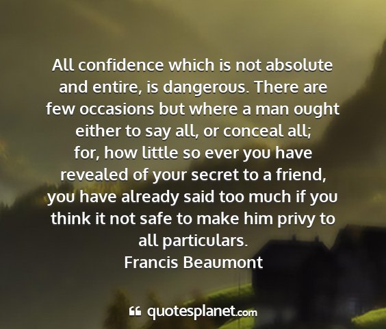 All confidence which is not absolute and entire, is dangerous. There are few occasions but where a man ought either to say all, or conceal all; for, how little so ever you have revealed of your secret to a friend, you have already said too much if you think it not safe to make him privy to all particulars.Francis Beaumont