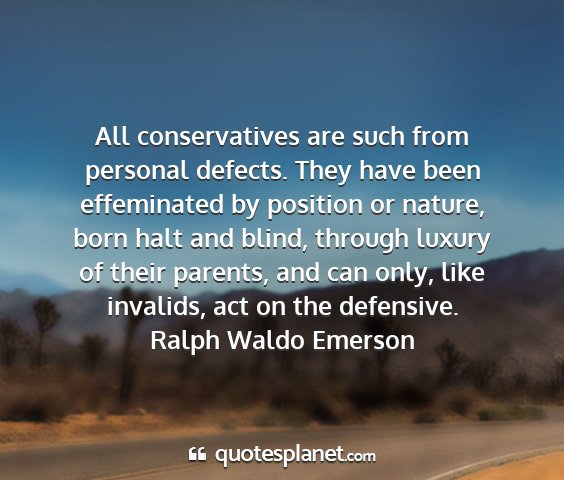 All conservatives are such from personal defects. They have been effeminated by position or nature, born halt and blind, through luxury of their parents, and can only, like invalids, act on the defensive.Ralph Waldo Emerson