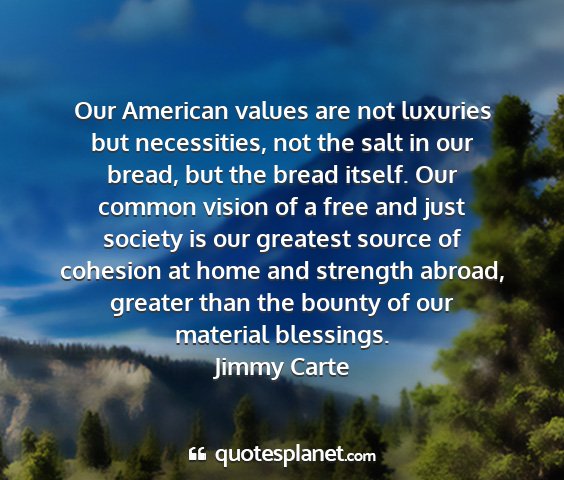 Our American values are not luxuries but necessities, not the salt in our bread, but the bread itself. Our common vision of a free and just society is our greatest source of cohesion at home and strength abroad, greater than the bounty of our material blessings.Jimmy Carte