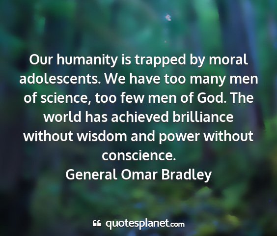 Our humanity is trapped by moral adolescents. We have too many men of science, too few men of God. The world has achieved brilliance without wisdom and power without conscience.General Omar Bradley