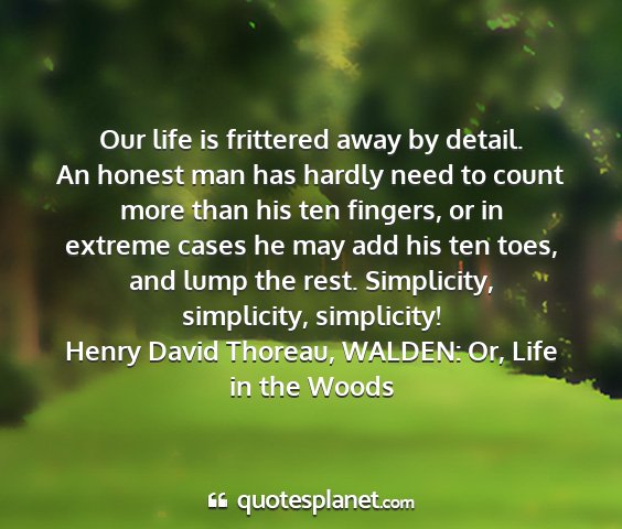 Our life is frittered away by detail. An honest man has hardly need to count more than his ten fingers, or in extreme cases he may add his ten toes, and lump the rest. Simplicity, simplicity, simplicity!Henry David Thoreau, WALDEN: Or, Life in the Woods