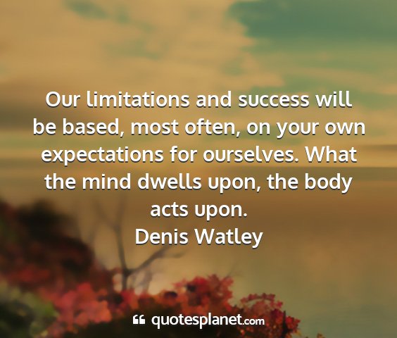 Our limitations and success will be based, most often, on your own expectations for ourselves. What the mind dwells upon, the body acts upon.Denis Watley