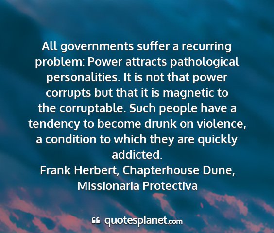All governments suffer a recurring problem: Power attracts pathological personalities. It is not that power corrupts but that it is magnetic to the corruptable. Such people have a tendency to become drunk on violence, a condition to which they are quickly addicted.Frank Herbert, Chapterhouse Dune, Missionaria Protectiva