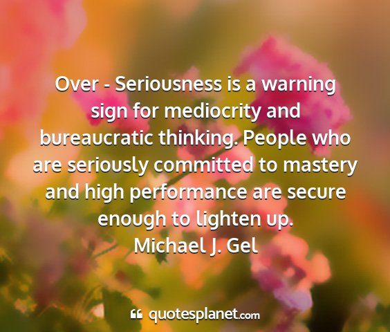Over - Seriousness is a warning sign for mediocrity and bureaucratic thinking. People who are seriously committed to mastery and high performance are secure enough to lighten up.Michael J. Gel
