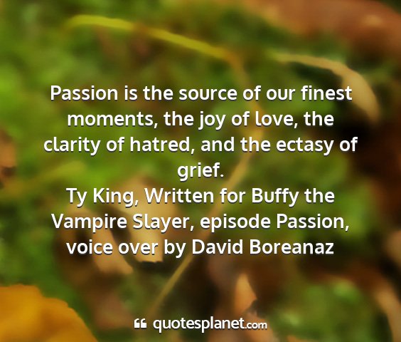 Passion is the source of our finest moments, the joy of love, the clarity of hatred, and the ectasy of grief.Ty King, Written for Buffy the Vampire Slayer, episode Passion, voice over by David Boreanaz