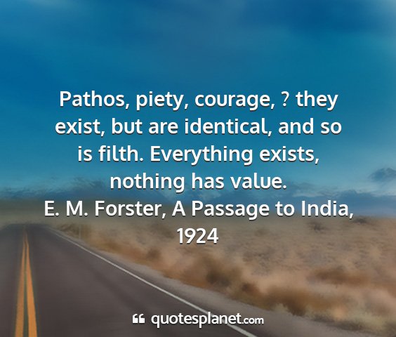 Pathos, piety, courage, ? they exist, but are identical, and so is filth. Everything exists, nothing has value.E. M. Forster, A Passage to India, 1924
