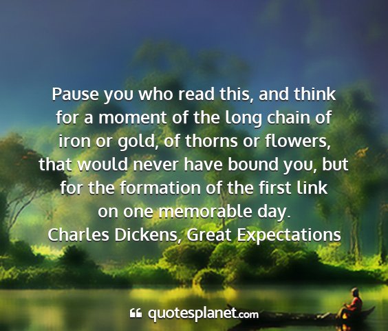 Pause you who read this, and think for a moment of the long chain of iron or gold, of thorns or flowers, that would never have bound you, but for the formation of the first link on one memorable day.Charles Dickens, Great Expectations