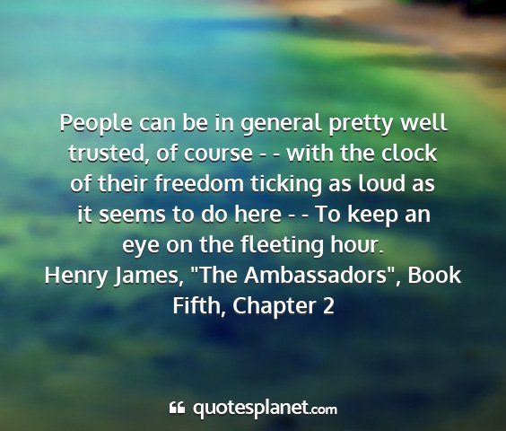 People can be in general pretty well trusted, of course - - with the clock of their freedom ticking as loud as it seems to do here - - To keep an eye on the fleeting hour.Henry James, "The Ambassadors", Book Fifth, Chapter 2