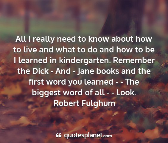 All I really need to know about how to live and what to do and how to be I learned in kindergarten. Remember the Dick - And - Jane books and the first word you learned - - The biggest word of all - - Look.Robert Fulghum