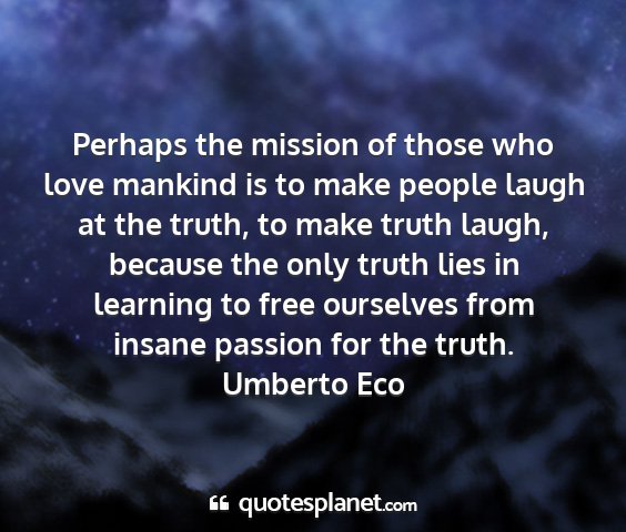 Perhaps the mission of those who love mankind is to make people laugh at the truth, to make truth laugh, because the only truth lies in learning to free ourselves from insane passion for the truth.Umberto Eco