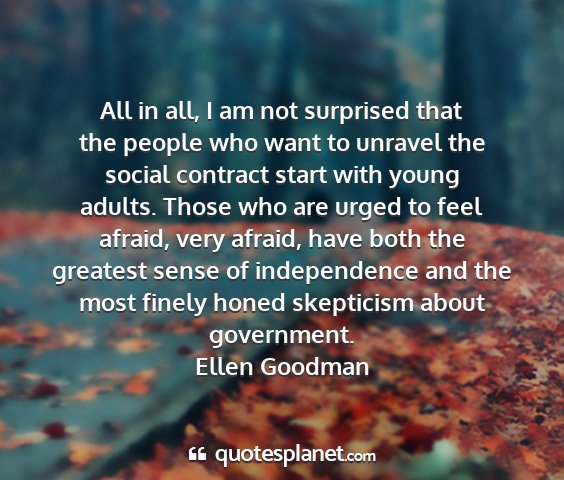 All in all, I am not surprised that the people who want to unravel the social contract start with young adults. Those who are urged to feel afraid, very afraid, have both the greatest sense of independence and the most finely honed skepticism about government.Ellen Goodman