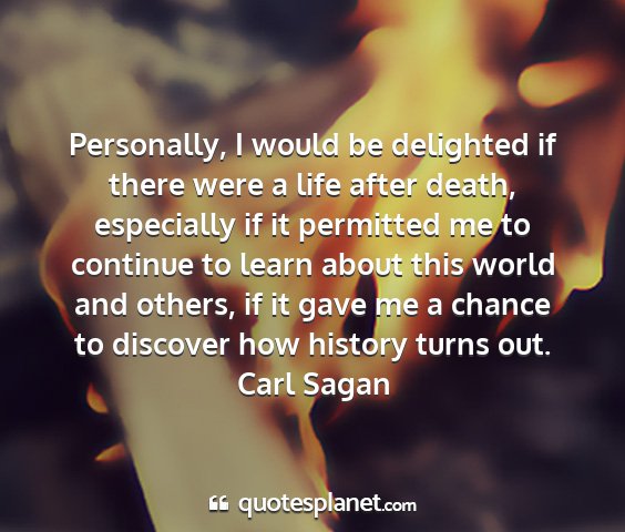 Personally, I would be delighted if there were a life after death, especially if it permitted me to continue to learn about this world and others, if it gave me a chance to discover how history turns out.Carl Sagan