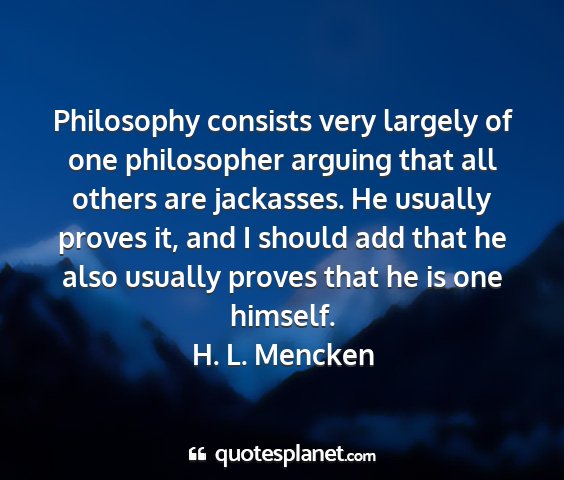 Philosophy consists very largely of one philosopher arguing that all others are jackasses. He usually proves it, and I should add that he also usually proves that he is one himself.H. L. Mencken