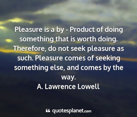 Pleasure is a by - Product of doing something that is worth doing. Therefore, do not seek pleasure as such. Pleasure comes of seeking something else, and comes by the way.A. Lawrence Lowell