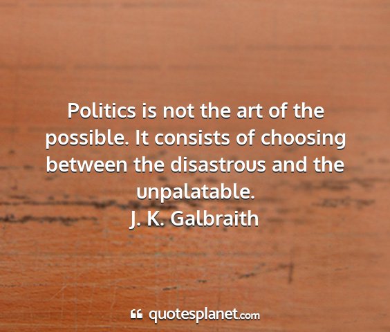 Politics is not the art of the possible. It consists of choosing between the disastrous and the unpalatable.J. K. Galbraith