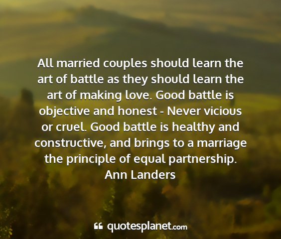 All married couples should learn the art of battle as they should learn the art of making love. Good battle is objective and honest - Never vicious or cruel. Good battle is healthy and constructive, and brings to a marriage the principle of equal partnership.Ann Landers