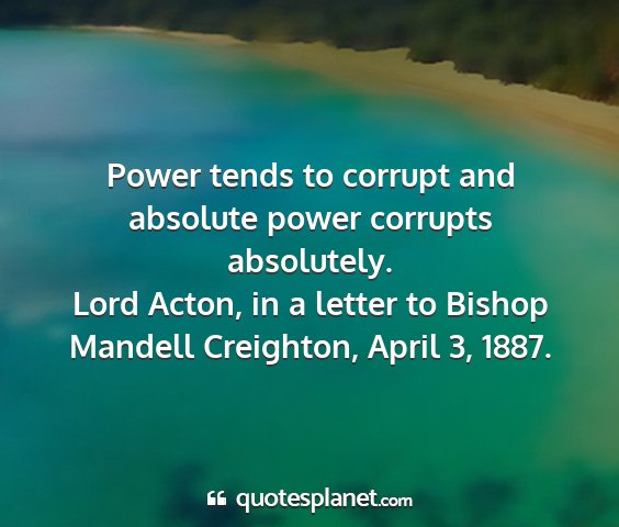 Power tends to corrupt and absolute power corrupts absolutely.Lord Acton, in a letter to Bishop Mandell Creighton, April 3, 1887.