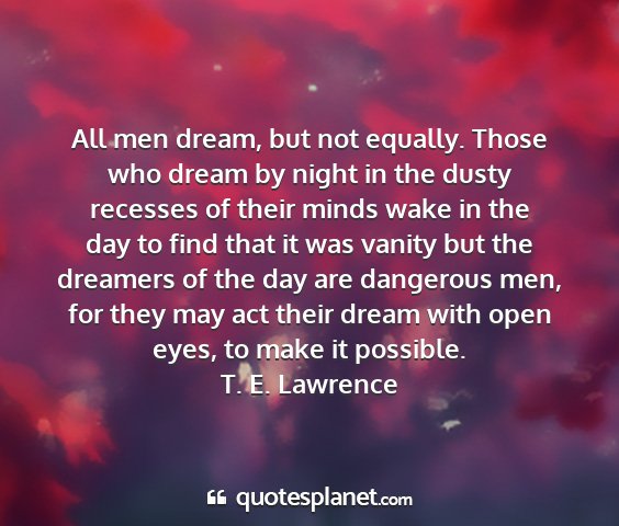 All men dream, but not equally. Those who dream by night in the dusty recesses of their minds wake in the day to find that it was vanity but the dreamers of the day are dangerous men, for they may act their dream with open eyes, to make it possible.T. E. Lawrence