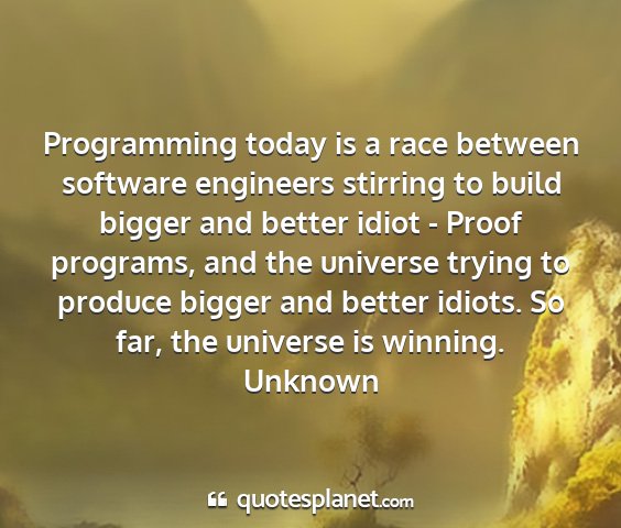 Programming today is a race between software engineers stirring to build bigger and better idiot - Proof programs, and the universe trying to produce bigger and better idiots. So far, the universe is winning.Unknown