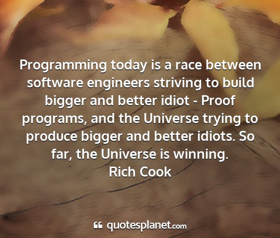 Programming today is a race between software engineers striving to build bigger and better idiot - Proof programs, and the Universe trying to produce bigger and better idiots. So far, the Universe is winning.Rich Cook