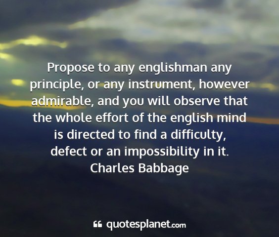 Propose to any englishman any principle, or any instrument, however admirable, and you will observe that the whole effort of the english mind is directed to find a difficulty, defect or an impossibility in it.Charles Babbage