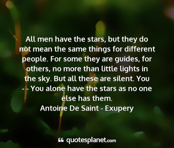 All men have the stars, but they do not mean the same things for different people. For some they are guides, for others, no more than little lights in the sky. But all these are silent. You - - You alone have the stars as no one else has them.Antoine De Saint - Exupery