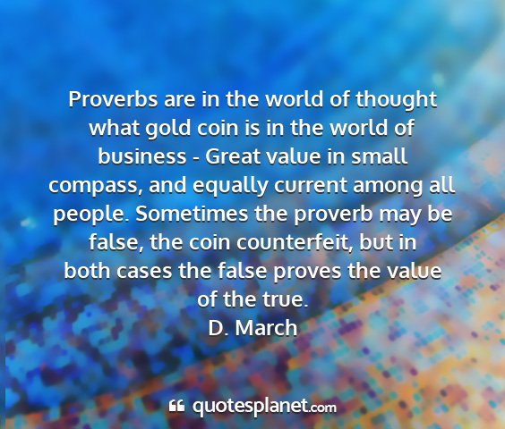 Proverbs are in the world of thought what gold coin is in the world of business - Great value in small compass, and equally current among all people. Sometimes the proverb may be false, the coin counterfeit, but in both cases the false proves the value of the true.D. March