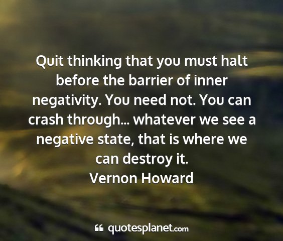 Quit thinking that you must halt before the barrier of inner negativity. You need not. You can crash through... whatever we see a negative state, that is where we can destroy it.Vernon Howard