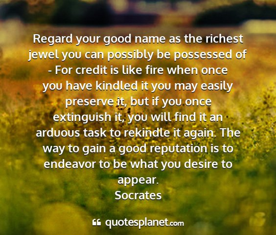 Regard your good name as the richest jewel you can possibly be possessed of - For credit is like fire when once you have kindled it you may easily preserve it, but if you once extinguish it, you will find it an arduous task to rekindle it again. The way to gain a good reputation is to endeavor to be what you desire to appear.Socrates