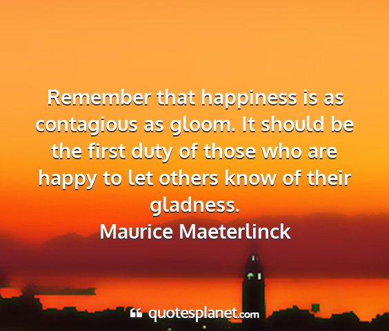 Remember that happiness is as contagious as gloom. It should be the first duty of those who are happy to let others know of their gladness.Maurice Maeterlinck