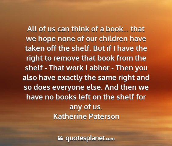 All of us can think of a book... that we hope none of our children have taken off the shelf. But if I have the right to remove that book from the shelf - That work I abhor - Then you also have exactly the same right and so does everyone else. And then we have no books left on the shelf for any of us.Katherine Paterson