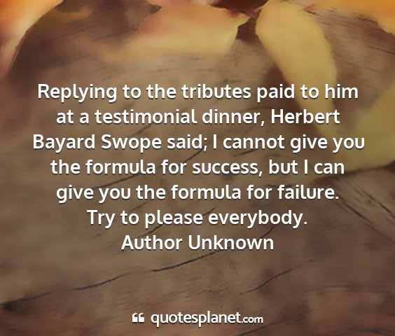 Replying to the tributes paid to him at a testimonial dinner, Herbert Bayard Swope said; I cannot give you the formula for success, but I can give you the formula for failure. Try to please everybody.Author Unknown