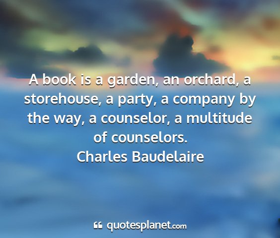 A book is a garden, an orchard, a storehouse, a party, a company by the way, a counselor, a multitude of counselors.Charles Baudelaire