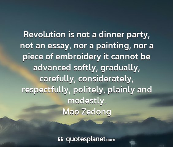 Revolution is not a dinner party, not an essay, nor a painting, nor a piece of embroidery it cannot be advanced softly, gradually, carefully, considerately, respectfully, politely, plainly and modestly.Mao Zedong