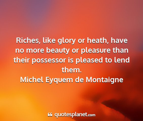 Riches, like glory or heath, have no more beauty or pleasure than their possessor is pleased to lend them.Michel Eyquem de Montaigne