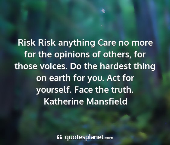 Risk Risk anything Care no more for the opinions of others, for those voices. Do the hardest thing on earth for you. Act for yourself. Face the truth.Katherine Mansfield