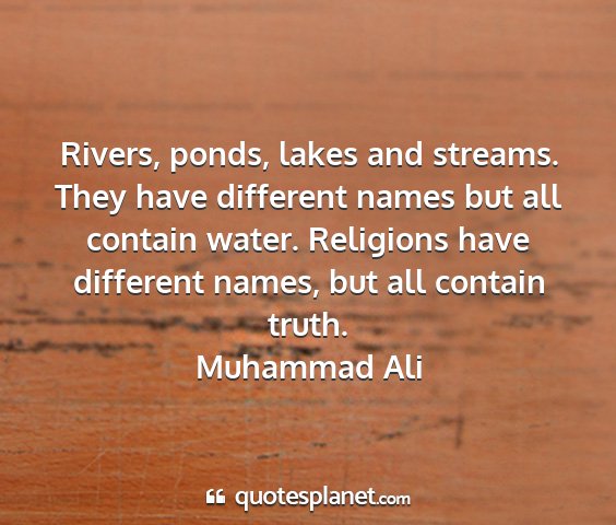 Rivers, ponds, lakes and streams. They have different names but all contain water. Religions have different names, but all contain truth.Muhammad Ali