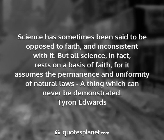 Science has sometimes been said to be opposed to faith, and inconsistent with it. But all science, in fact, rests on a basis of faith, for it assumes the permanence and uniformity of natural laws - A thing which can never be demonstrated.Tyron Edwards