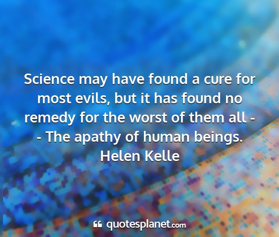 Science may have found a cure for most evils, but it has found no remedy for the worst of them all - - The apathy of human beings.Helen Kelle
