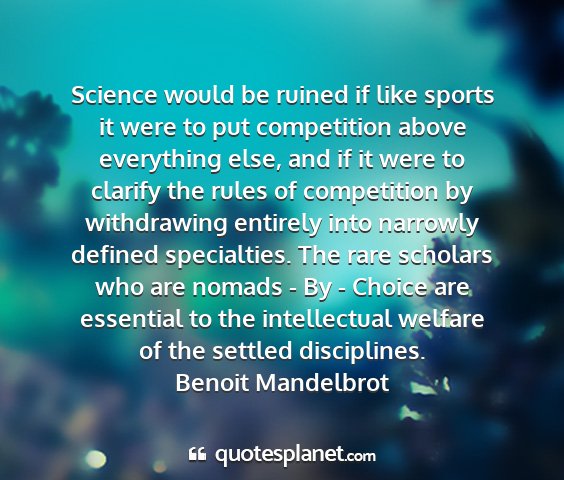 Science would be ruined if like sports it were to put competition above everything else, and if it were to clarify the rules of competition by withdrawing entirely into narrowly defined specialties. The rare scholars who are nomads - By - Choice are essential to the intellectual welfare of the settled disciplines.Benoit Mandelbrot