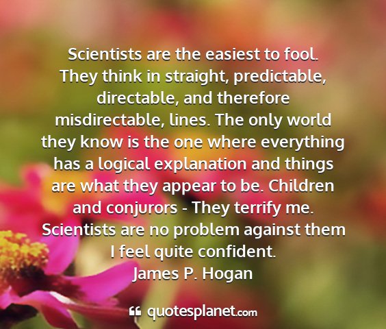 Scientists are the easiest to fool. They think in straight, predictable, directable, and therefore misdirectable, lines. The only world they know is the one where everything has a logical explanation and things are what they appear to be. Children and conjurors - They terrify me. Scientists are no problem against them I feel quite confident.James P. Hogan