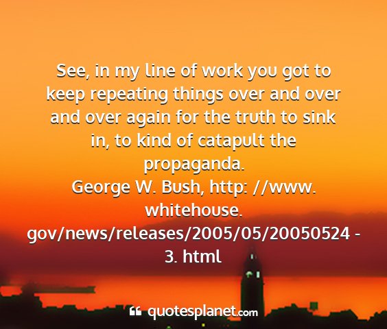 See, in my line of work you got to keep repeating things over and over and over again for the truth to sink in, to kind of catapult the propaganda.George W. Bush, http: //www. whitehouse. gov/news/releases/2005/05/20050524 - 3. html