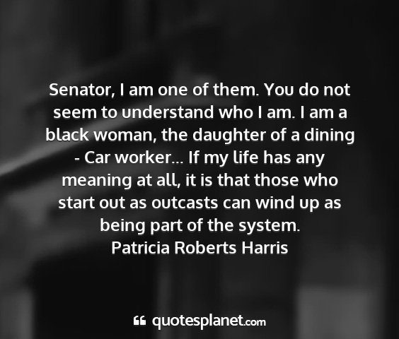 Senator, I am one of them. You do not seem to understand who I am. I am a black woman, the daughter of a dining - Car worker... If my life has any meaning at all, it is that those who start out as outcasts can wind up as being part of the system.Patricia Roberts Harris