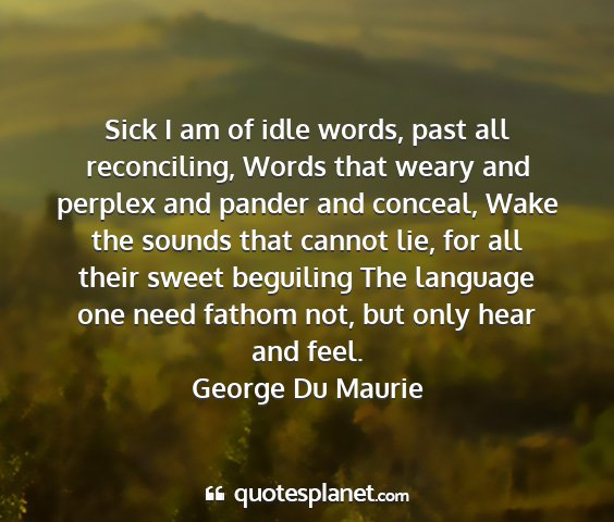 Sick I am of idle words, past all reconciling, Words that weary and perplex and pander and conceal, Wake the sounds that cannot lie, for all their sweet beguiling The language one need fathom not, but only hear and feel.George Du Maurie