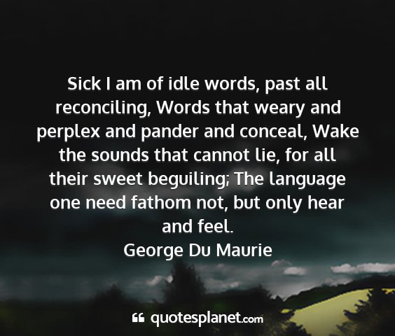 Sick I am of idle words, past all reconciling, Words that weary and perplex and pander and conceal, Wake the sounds that cannot lie, for all their sweet beguiling; The language one need fathom not, but only hear and feel.George Du Maurie
