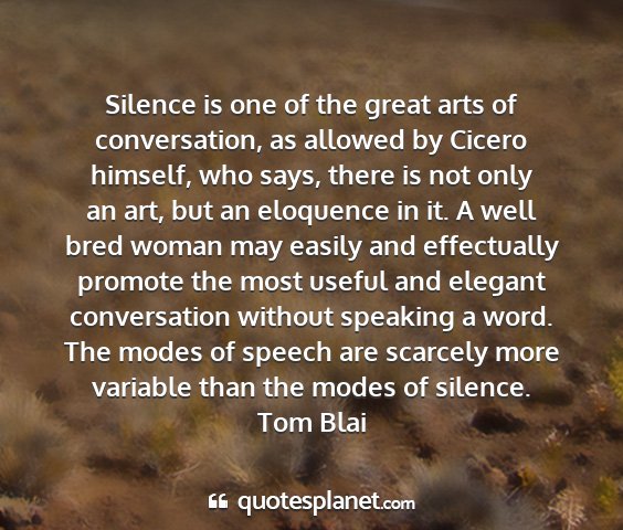 Silence is one of the great arts of conversation, as allowed by Cicero himself, who says, there is not only an art, but an eloquence in it. A well bred woman may easily and effectually promote the most useful and elegant conversation without speaking a word. The modes of speech are scarcely more variable than the modes of silence.Tom Blai
