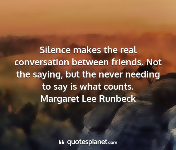 Silence makes the real conversation between friends. Not the saying, but the never needing to say is what counts.Margaret Lee Runbeck