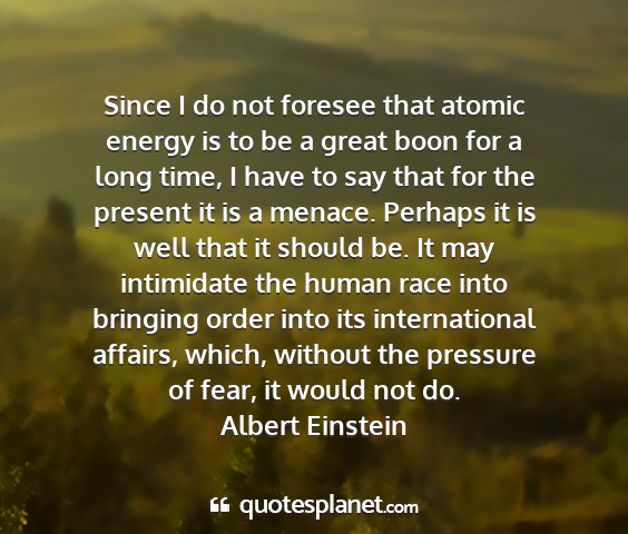 Since I do not foresee that atomic energy is to be a great boon for a long time, I have to say that for the present it is a menace. Perhaps it is well that it should be. It may intimidate the human race into bringing order into its international affairs, which, without the pressure of fear, it would not do.Albert Einstein