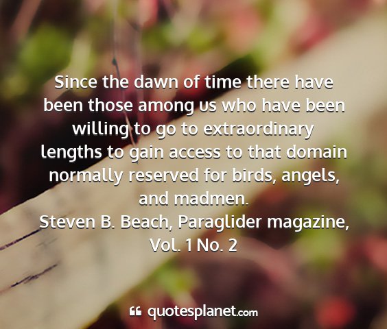 Since the dawn of time there have been those among us who have been willing to go to extraordinary lengths to gain access to that domain normally reserved for birds, angels, and madmen.Steven B. Beach, Paraglider magazine, Vol. 1 No. 2